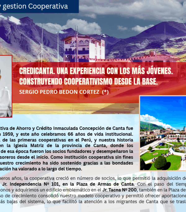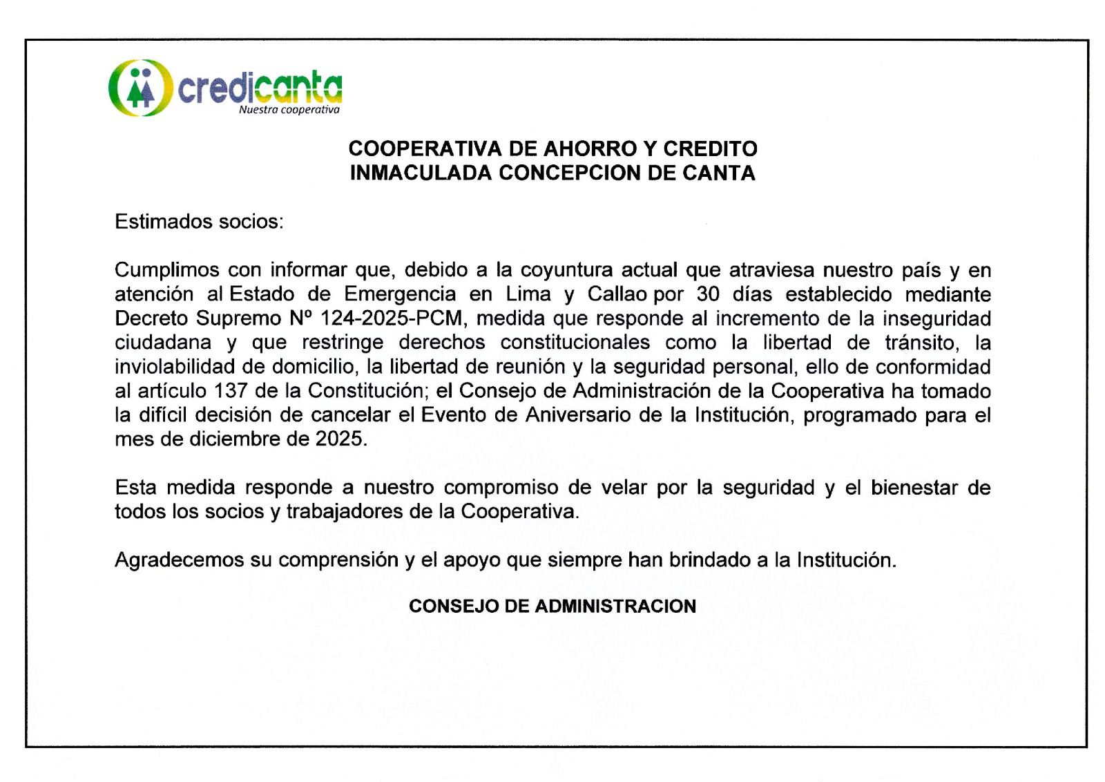 En la Cooperativa de Ahorro y Credito Inmaculada Concepcion de Canta Ltda, agradecemos la confianza de todos nuestros socios, que nos permite seguir trabajando con compromiso para contribuir al bienestar económico y social de nuestra comunidad.
