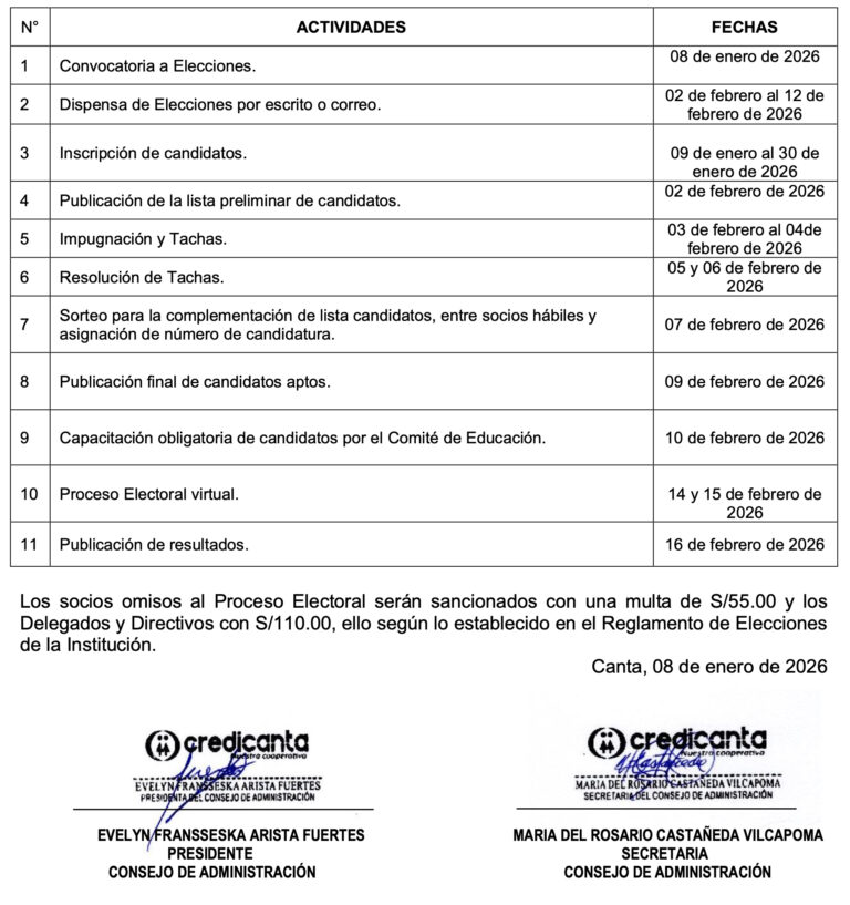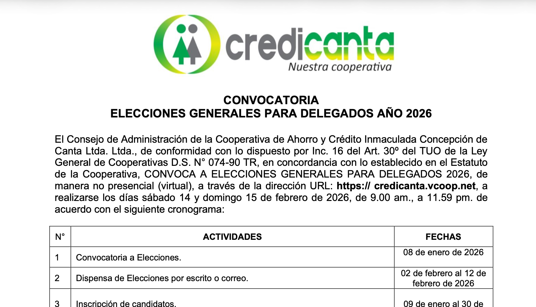 El Consejo de Administración de la Cooperativa de Ahorro y Crédito Inmaculada Concepción de Canta Ltda. Ltda., de conformidad con lo dispuesto por Inc. 16 del Art. 30º del TUO de la Ley General de Cooperativas D.S. N° 074-90 TR, en concordancia con lo establecido en el Estatuto de la Cooperativa, CONVOCA A ELECCIONES GENERALES PARA DELEGADOS 2026, de manera no presencial (virtual), através de la dirección URL: https:// credicanta.vcoop.net, a realizarse los días sábado 14 y domingo 15 de febrero de 2026, de 9.00 am., a 11.59 pm. de acuerdo con el siguiente cronograma:
